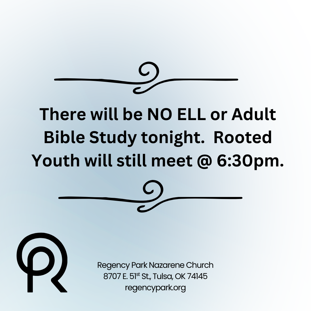 There will be NO ELL or Adult Bible Study tonight. Rooted Youth will still meet at 6:30pm.Â